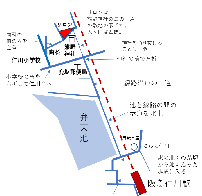 仁川駅北側の踏切から弁天池に沿って北上、線路沿いを北へ直進して鹿塩熊野神社の前(鹿塩郵便局の向かい)を左折、
