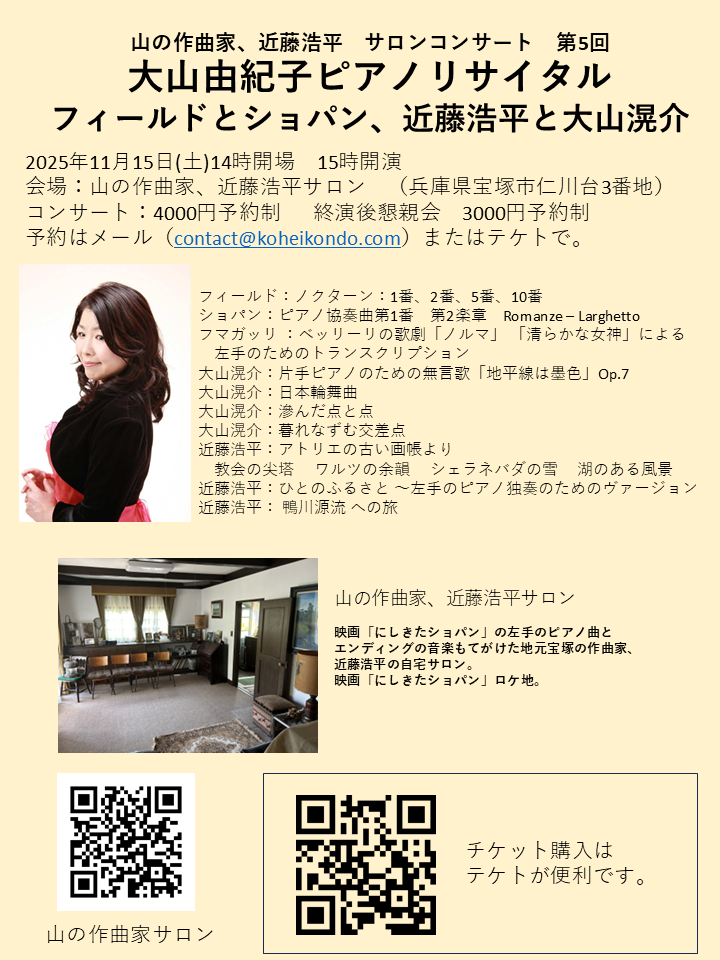 2025年11月15日(土) 14時開場 15時開演 山の作曲家、近藤浩平サロンコンサート 第5回 山の作曲家サロン(兵庫県宝塚市仁川台3)